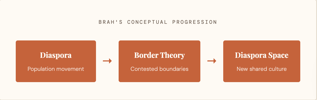 Exploring the concept of Avtar Brah's "Diaspora Space" and how it dwells on borders, belonging, and cultural identity through a post-colonial theory lens.